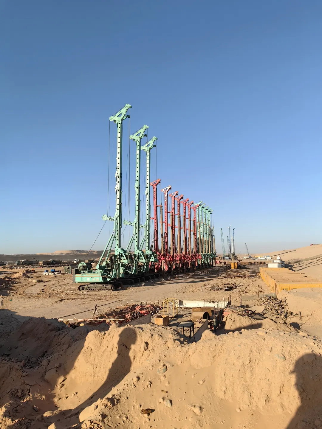 自2025开年以来,中国水电基础局与上海金泰紧密携手的高质量标杆项目频出,上海金泰10多台旋挖钻机又于中东区域沙特NEOM新城桩基项目M48区域成功创造中东地区基建新标杆——金泰SH55旋挖钻机完成中东区域目前最大最深桩基106.16米施工,以卓越技术与高效协作,为全球基建领域贡献又一典范之作。